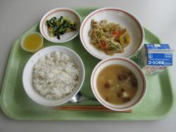 今日の給食は「ごはん、豚肉の生姜焼き、小松菜ののりあえ、なめこの味噌汁、みかんゼリー」
