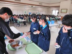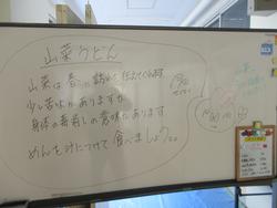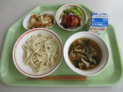 【給食】山菜うどん、生揚げのみそチーズ焼き、小松菜の辛し和え、じゃがまる君、牛乳