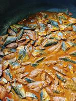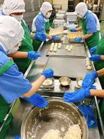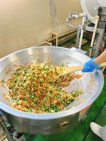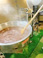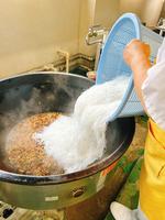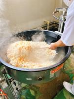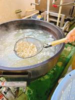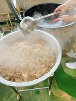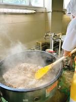 さばのみそ煮は、1釜に290個のさばを入れて、みそ、酒、みりん、砂糖などの調味料でコトコトと1時間ほど煮ました。臭み消しで、ねぎとしょうがのぶつ切りも加えました。こってりと味がしみたさばは、子どもたちにも人気がありました。