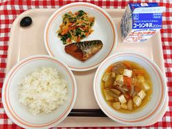 ごはん さばのみそ煮 おかかあえ けんちん汁 ぶどう 牛乳