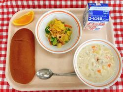 黒糖パン クラムチャウダー 野菜チップスサラダ オレンジ 牛乳
