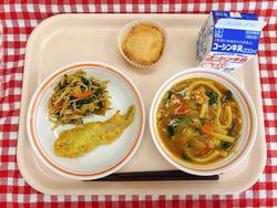 カレーうどん ししゃもフリッター かんぴょうのごまずあえ きなこおはぎ 牛乳