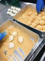 鮭のハーブフライは、レモン汁、バジル、白ワイン、塩、コショウで下味をつけた鮭に衣をつけて油で揚げました。気温が高い中、熱い油の前で520個の鮭を揚げてくれました。調理員さんは皆、汗だくでがんばってくれています。早く涼しくなるといいのですが・・・。