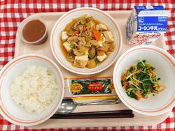 ごはん 小魚ふりかけ カレー肉じゃが かきたま汁 きなこ豆 牛乳