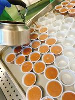 ココアプリンは牛乳と豆乳で作りました。やかんに入れてカップにそそぎます。粗熱がとれたら冷蔵庫で冷やし固めます。