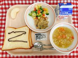 食パン チョコ&ホワイト ガーリックチキンのきのこソース ポテトのフレンチサラダ アルファベットスープ 梨 牛乳