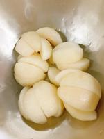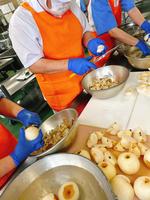 今日の梨は福島県産の豊水でした。66個の梨の皮をむき芯をとることはとても大変な作業ですが、きれいにむいてクラスごとに入れてくれました。