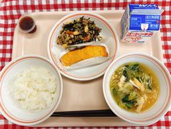 ごはん 鮭のもみじ焼き ひじきのいり豆腐 みそ汁 ひとくちぶどうゼリー 牛乳