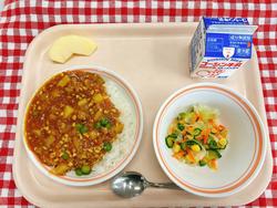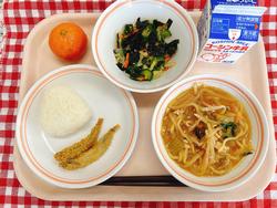 ジャージャー豆腐の生揚げは35kg使いました。油抜きをするため、一度ゆでてから肉みそと炒めました。ピリ辛だったので、ごはんがすすみました。6年生の教室では、体育大会の途中経過を放送で聞いて盛り上がっていました。