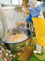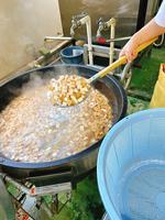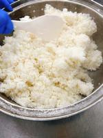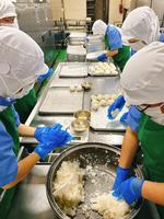 新米の季節になりました。今日のお米は、松戸市旭町で農家をしている「横山さんちのコシヒカリ」でした。松戸のお米は生産量が少ないので、給食で食べられるのは貴重なことです。今日は、ごはんそのものの味をあじわってほしいので、シンプルな塩むすびにしました。調理員さんは、あまりかたくにぎらないように一つひとつ丁寧にむすんでくれました。子どもたちは、「もちもちしてる!」「とってもおいしい!」と喜んで食べていました。