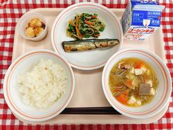 ごはん さんまのかんろ煮 なめたけ和え 豚汁 白玉の黒蜜きなこ 牛乳