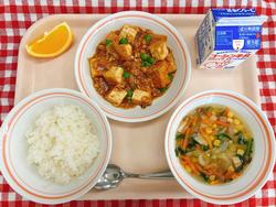 ごはん ジャージャー豆腐 中華風コーンスープ オレンジ 牛乳