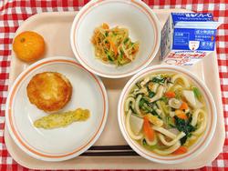 みそ焼きおにぎり 五目うどん わかさぎフリッター ハリハリづけ 冷凍みかん 牛乳