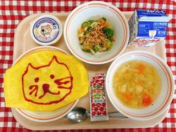 オムライス ツナサラダ コンソメスープ ブルーベリーゼリー 牛乳