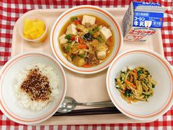 ごはん かつおふりかけ 肉豆腐 かんぴょうのごまずあえ フルーツミックス 牛乳
