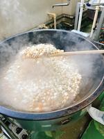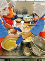 肉豆腐は32kgの豆腐を使いました。大量調理で煮崩れしないように、豆腐をゆでてから他の食材と合わせました。