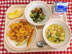 メキシカンピラフ わかさぎフリッター ひじきサラダ レタスとトマトのスープ りんご 牛乳