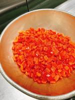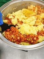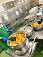 メキシカンピラフはカレー味で炊きこんだごはんと、別で炒めた具材と混ぜ合わせます。今日は6つの炊飯かまで炊きました。味が均等になるようによく混ぜます。