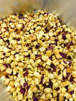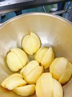りんごは、皮をむく人、等分に切って芯を取る人、塩水につけて数える人、それぞれ分担しておこないます。切ったりんごは、4つずつきれいに並べて入れてくれます。みんな仕事が丁寧です。