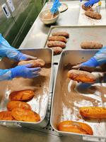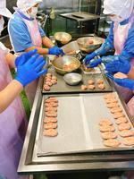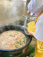 つくねは、とりひき肉、ぶたひき肉、れんこん、豆腐、ねぎなどが入っていました。角切りのれんこんを入れたのでシャキシャキとした食感がよかったです。今朝は冷え込み、給食室の寒さも厳しくなってきました。お肉をこねていると、手が冷たく体が冷えてしまいます。そのような中で、520個のつくねを一つひとつ作ってくださいました。