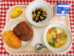 ココアときなこの二色あげパン 野菜のスープ煮 ひたし青豆 バナナ 牛乳