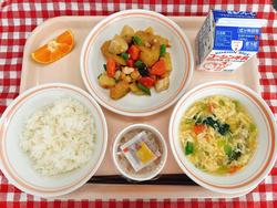 ごはん あげぎょうざ 春雨のピリカラいため たまごスープ 早香 牛乳
