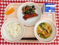 今日の給食は、さつまいも、だいこん、にんじん、あじさいねぎ、ほうれんそう、黒だいなど千葉県でとれたものがたくさん使われていました。黒だいは、しょうゆとみりん、にんにく、しょうがで下味をつけ片栗粉をつけて油で揚げました。ふっくらした身がおいしく子どもたちにも人気がありました。