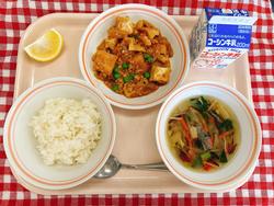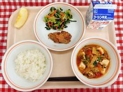 ごはん 鶏のピリカラ焼き ほうれんそうののりサラダ 豆腐のキムチチゲ りんご 牛乳