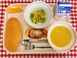 コッペパン 黒だいのトマトソース焼き コーンサラダ パンプキンポタージュ オレンジ 牛乳