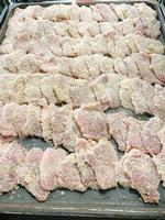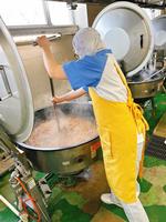 今日のりんごは青森県産の「サンふじ」という品種でした。「サンふじ」は袋をかけないで育て、太陽(Sun)の光をたっぷりあびたりんごです。一つひとつ皮をむき芯をとって、色が変わらないように塩水につけます。70個のりんごを6人でむいてくれました。
