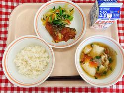 カリカリがんもは、豆腐、たら、ツナ、人参、枝豆を混ぜ合わせがんもを作り、まわりにコーンフレークをまぶして油で揚げました。形を作ったらクッキングシートごと揚げると崩れずに上手にカリカリに揚がります。6年生からは、「さつまいもごはんとの組み合わせがとてもおいしかったです。」の感想がありました。