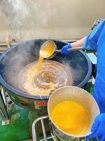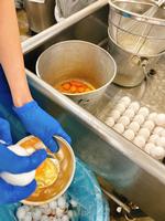 ごはんの上にとんかつをのせ、玉ねぎ、にんじん、しらたきなど甘じょっぱく煮たものを卵でとじて上からかけて食べました。6年生が考えた初めてのかつ丼! みんな「おいしい!」「最高!」と大好評でした。