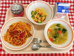 スパゲッティナポリタン お揚げのサラダ 白菜とハムのスープ チョコレートマフィン 牛乳
