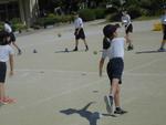 子供たちは初めに配られた千葉ロッテマリーンズの帽子をかぶり、講師の先生のお話を聞きます。講師の先生の説明はとても分かりやすく、子供たちはボールを上に投げてキャッチしたり、ペアになって相手に投げたり、遠くに思いっきり投げたりと様々な動きを体験しました。