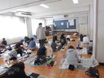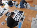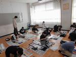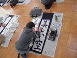 「美しい空」の最初の文字「美」の大きさをちょうどよく収められるかがポイントのようで、最初に大きく書きすぎると残りの三文字がちいさくなってしまいます。お手本を隣においてじっくりと見ながら慎重に書いている子もいれば、一文字目でがっくりしている子もいました。