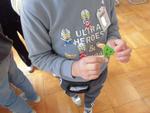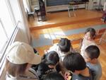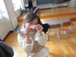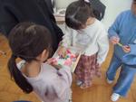 話が終わると、プレゼント配付です。今月は2月ということでハートマークに折った折り紙です。子供たちは3人の保護者の方々の周りに集まり、プレゼントの折り紙を選んでいました。