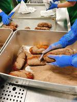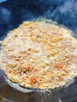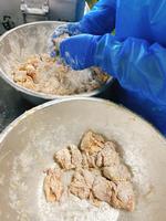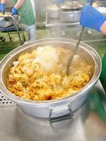 ↓キムチ、豚肉、たくあんなどが入った具を、ごはんにまぜているところです。1釜に10kgのごはんが入っているので、味にムラがないないよう混ぜこみます。