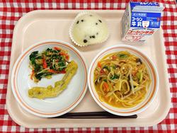 なめしおにぎり カレーうどん きびなごカリカリフライ チョレギサラダ ココアプリン 牛乳