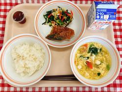 ごはん さばのみそ煮 ほうれんそうののりサラダ かきたま汁 ひとくちぶどうゼリー 牛乳