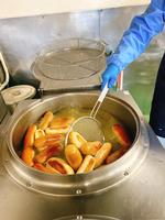 タンタンメンの麺は冷凍のちゃんぽん麵を29kg使いました。ギリギリにゆでてスープに入れます。少しでものびないように、調理員さんが作ってくれています。