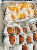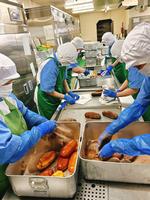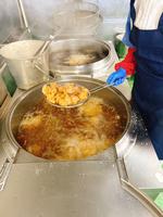 給食室では、前日から数の確認や段取りなど入念に準備をして臨んでくださいました。あげパンのコツは、パンを高温の油でサッと揚げ、乾かないうちにすばやく粉をまぶすことです。みんなで声をかけ合いながら、2種類のあげパンがおいしくできました。
