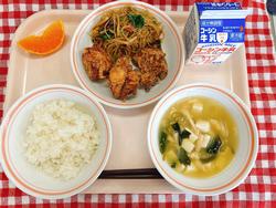ごはん とりのからあげ 春雨のピリカラいため みそ汁 せとかオレンジ 牛乳