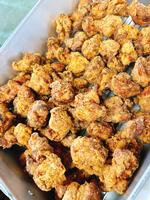 からあげは、片栗粉と米粉を混ぜた粉をつけてカリッと揚がるように二度揚げしました。