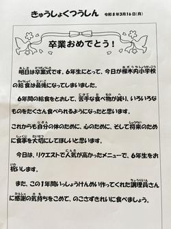 今年度最後の給食は、6年生のリクエストで人気だったものばかりでした。クラスを回ると、「1年間給食ありがとう」の声やメッセージがたくさんありました。1年間、おいしい給食を作ってくださった調理員さんに感謝の気持ちをこめて、残さずきれいに食べることができました。