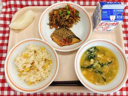 コーンちゃめし さばのピリカラ焼き 五目きんぴら みそ汁 梨