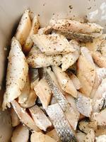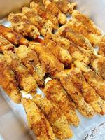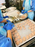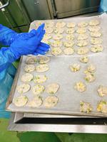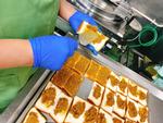 鮭のチーズ春巻きは人気メニューのひとつです。レモン汁、塩、コショウ、バジルで下味をつけた鮭とチーズを春巻きの皮で包んで油で揚げました。調理員さんは、520個の春巻きを、チーズが出ないようにしっかり包んでくれました。カリッとおいしくできました。
