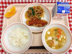 ツナとトマトのスパゲッティ チップスサラダ かぼちゃマフィン 牛乳