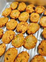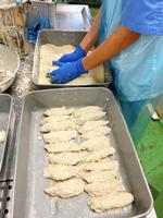 ちぎりあげは、たらのすり身といわしのすり身、ねぎ、コーン、枝豆を混ぜ合わせて油で揚げました。520個一つひとつ形を作って揚げてくれました。