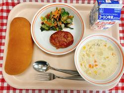 コッペパン ごぼう入りハンバーグ 海藻サラダ コーンポタージュ 牛乳