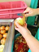 ハンバーグには、10kgの玉ねぎが入りました。量が多くて大変ですが、一つひとつ手で皮をむいていきます。
